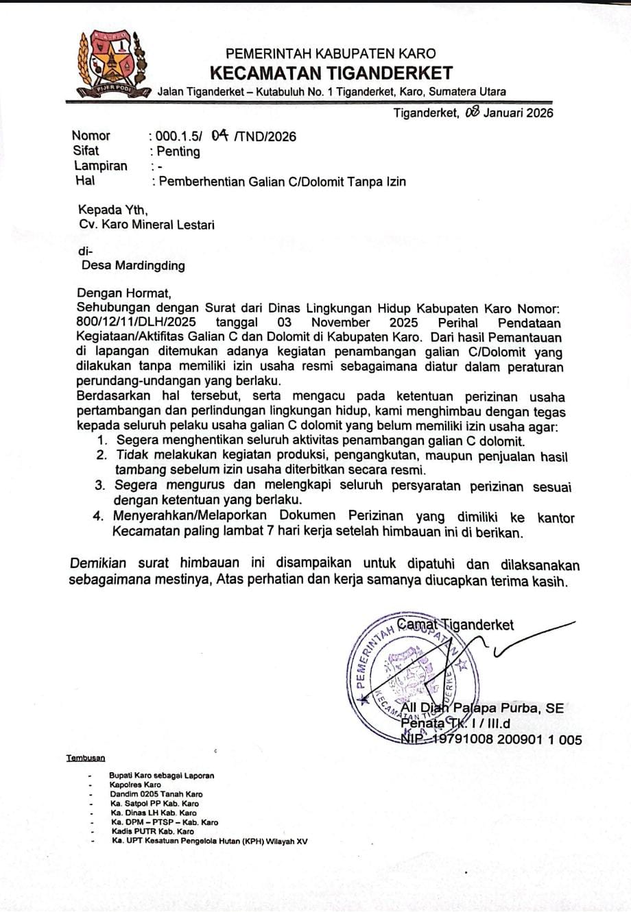 Abaikan Himbauan Camat Tiga Nderket, CV Karo Mineral Lestari Terus Beroperasi: Kebal Hukum?