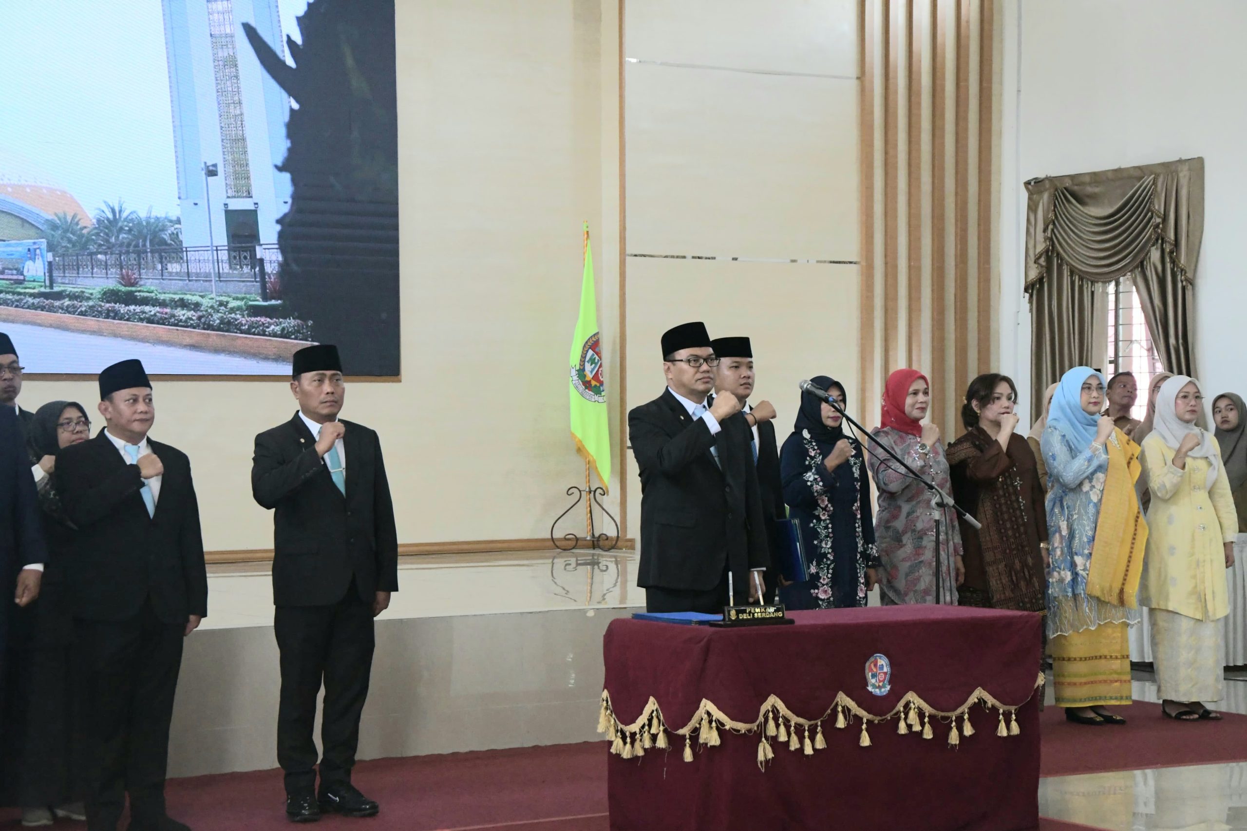 Bupati Deliserdang, dr. H. Asri Ludin Tambunan didampingi Wabup Lom Lom Suwondo, SS saat memimpin pelantikan Yudi Hilmawan sebagai Kadispora, usai sebelumnya dicopot dari Kadisdik. (Diskominfo Ds for Sumutpost.id)