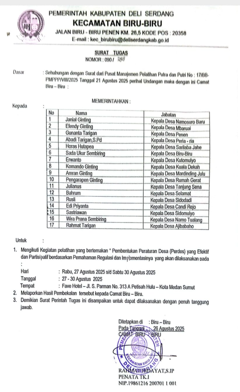 Dalam surat tugas bernomor: 090/388 tanggal 26 Agustus 2025, yang ditandatangani Rahmat Hidayat, S.IP selaku Camat Kecamatan Biru-Biru, dengan tegas memerintahkan 17 kepala desa di wilayahnya untuk mengikuti kegiatan bimbingan teknis (bimtek) selama empat hari di Hotel Griya Jalan Tengku Amir Hamzah, Medan.