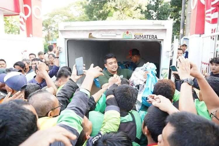 Ratusan pengemudi ojek online tampak antusias menyambut paket berisi beras, minyak goreng, gula, bubuk teh, dan mie instan. Tak hanya para ojol, warga yang melintas pun ikut berhenti sejenak dan berebut untuk menerima bantuan yang diserahkan langsung oleh orang nomor satu di Sumut tersebut.