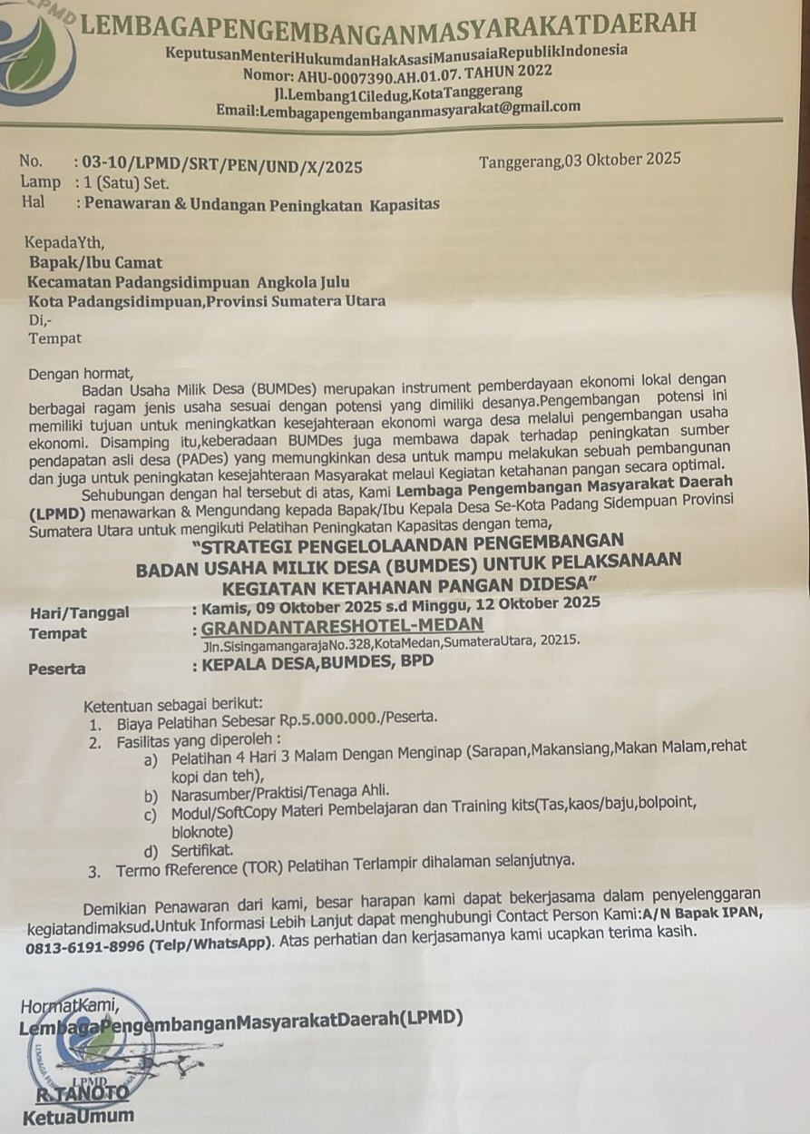 Surat LPMD yang berasal dari Tangerang untuk Kades se-Kota Padangsidimpuan yang dilaksanakan di Medan. (Ist/Sumutpost.id)