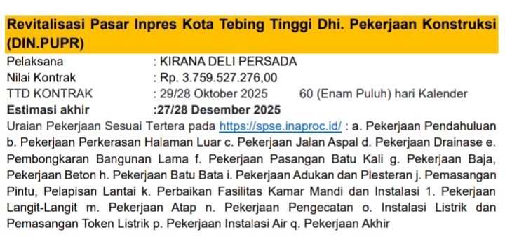 3. Proyek Revitalisasi Pasar Inpres Kota Tebingtinggi (Dinas PUPR). Pelaksananya adalah Kirana Deli Persada dengan Nilai Kontrak Rp. 3.759.527.276. Tanda Tangan Kontrak dilakukan pada 29/28 Oktober 2025 dengan jangka Waktu Penyelesaian selama 60 hari kalender dan Estimasi Selesai pada 27–28 Desember 2025.