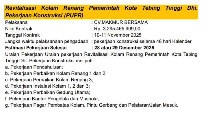 1. Proyek Revitalisasi Kolam Renang Pemerintah Kota Tebingtinggi (Dinas PUPR). Pelaksananya CV Makmur Bersama dengan Nilai Kontrak Rp. 3.295.465.909. Tanggal Kontrak dimulai 10–11 November 2025 dengan Jangka Waktu Penyelesaian 48 hari kalender dan Estimasi Selesai 28–29 Desember 2025.
