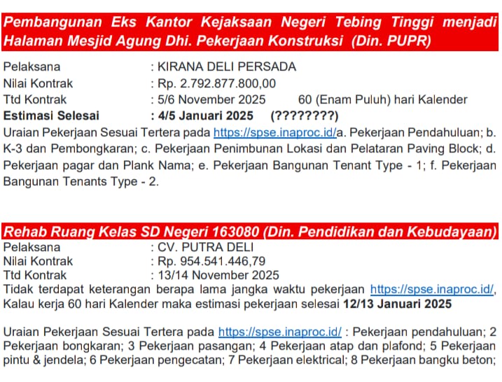 4. Proyek Pembangunan Eks Kantor Kejaksaan menjadi Halaman Masjid Agung (Dinas PUPR). Pelaksananya Kirana Deli Persada dengan Nilai Kontrak Rp. 2.792.877.800. Tanda Tangan Kontrak dilakukan pada tanggal 5–6 November 2025 dengan Jangka Waktu Penyelesaian 60 hari kalender. Estimasi Selesai 4–5 Januari 2026.