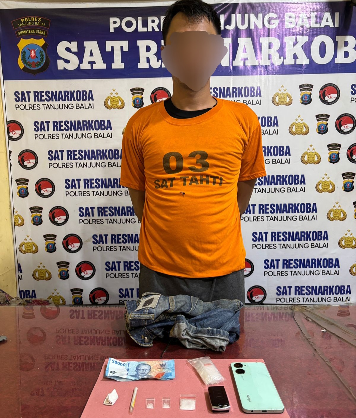 Laki-laki tersebut diringkus personel Satres Narkoba pada hari Kamis tanggal 23 April 2026 sekira pukul 22.30 WIB dari kawasan Jalan H.M. Nur, Lingkungan II, Kelurahan Pahang, Kecamatan Datuk Bandar, Kota Tanjungbalai.