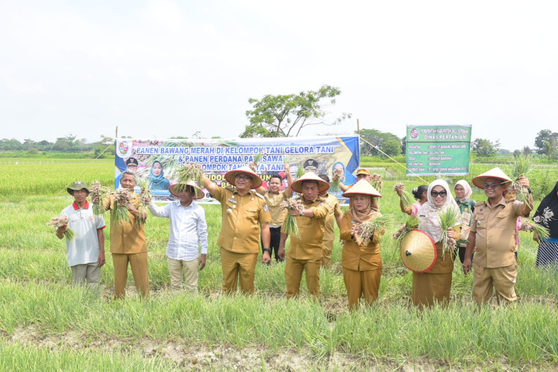 Usai panen bawang merah, Bupati dan Wakil Bupati melanjutkan dengan panen padi di lahan milik Poktan Jaya Tani di desa yang sama. Total luas lahan sawah Poktan Jaya Tani mencapai 70 hektare.