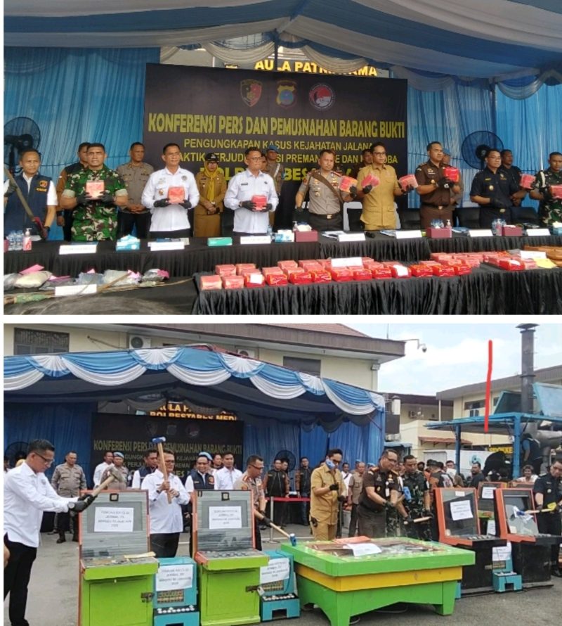 Kapolrestabes Medan, Kombes Pol Dr, Jean Calvijn Simanjuntak, SIK, MH didampingi Walikota Medan, Rico Tri Putra Bayu Waas, Kajari Medan, Ridwan Sujana Angsar, Kepala BBNK Deliserdang, Kombes Pol Joshua Tampubolon, Kabid Berantas dan Intelijen BNNP Sumut, Kombes Pol Charles P Sinaga, Kasat Reskrim, AKBP Bayu Putro Wijayanto dan Kasat Narkoba, Kompol M Yusuf Rafli Nugraha saat menunjukkan barang bukti. Dan saat merusak barang bukti yang disita. (Ist/Sumutpost.id)