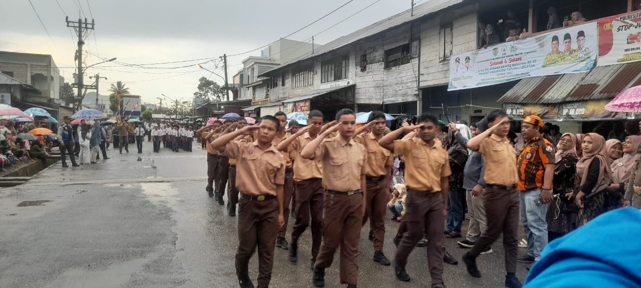 Barisan pawai dilepas Sekda Tapsel Sopyan Adil dari depan Mapolsek Sipagimbar, menuju mimbar penghormatan di depan Pasar Sipagimbar.