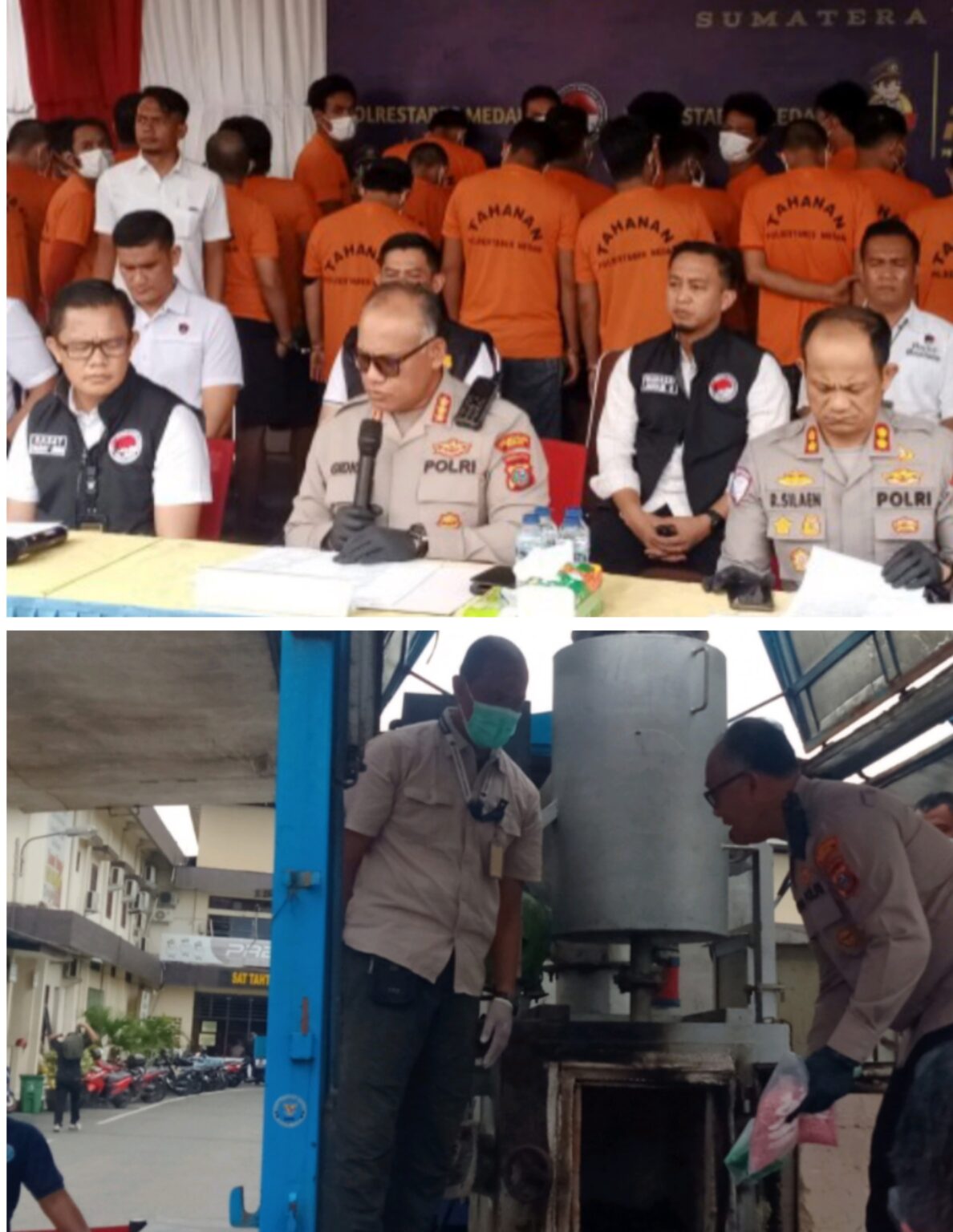 Kapolrestabes Medan, Kombes Gidion Arif Setyawan didampingi Waka Polrestabes Medan, AKBP Rudi Silaen dan Kasat Narkoba, AKBP Thommy Aruan saat menggelar konferensi Pers pemusnahan barang bukti narkoba. Dan bawah, Kombes Gidion Arif Setyawan saat memasukkan sabu ke mesin insinerator. (Ist/HO/Sumutpost.id)