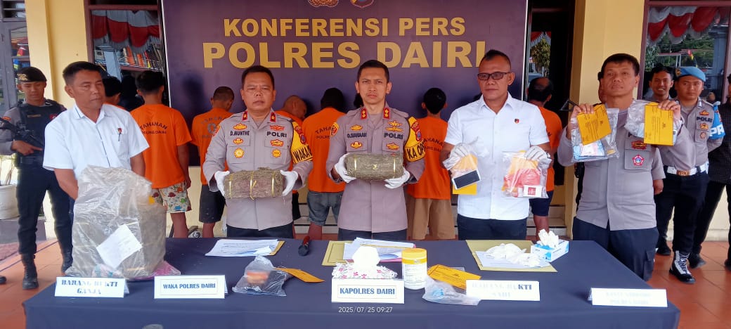 DAIRI, Sumutpost.id – Polres Dairi menggelar konferensi pers terkait pengungkapan narkotika selama bulan Juli 2025, Jumat (25/7/025). Selama satu bulan berhasil diungkap 8 kasus narkotika, dengan jumlah tersangka sebanyak 10 orang.