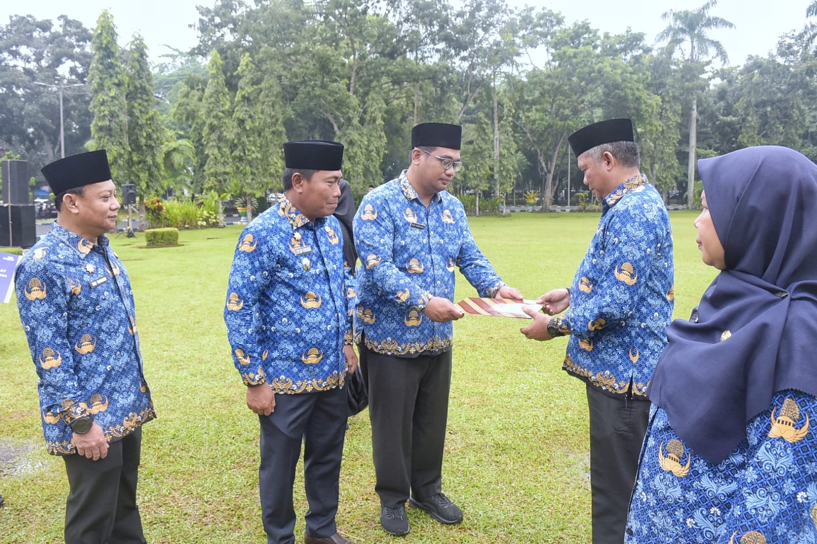Penyerahan Surat Keputusan (SK) Pemberhentian Dengan Hormat Tidak Atas Permintaan Sendiri (PDHTAPS) kepada dua ASN oleh ekretaris Daerah Deliserdang, Dedi Maswardy SSos MAP dan Asisten Administrasi Umum, Rudi Akmal Tambunan ST MAB pada Apel Hari Kesadaran Nasional di halaman Kantor Bupati yang dipimpin Wakil Bupati (Wabup) Lom Lom Suwondo SS, Jumat (17/10/2025). (Diskominfo Ds for Sumutpost.id)